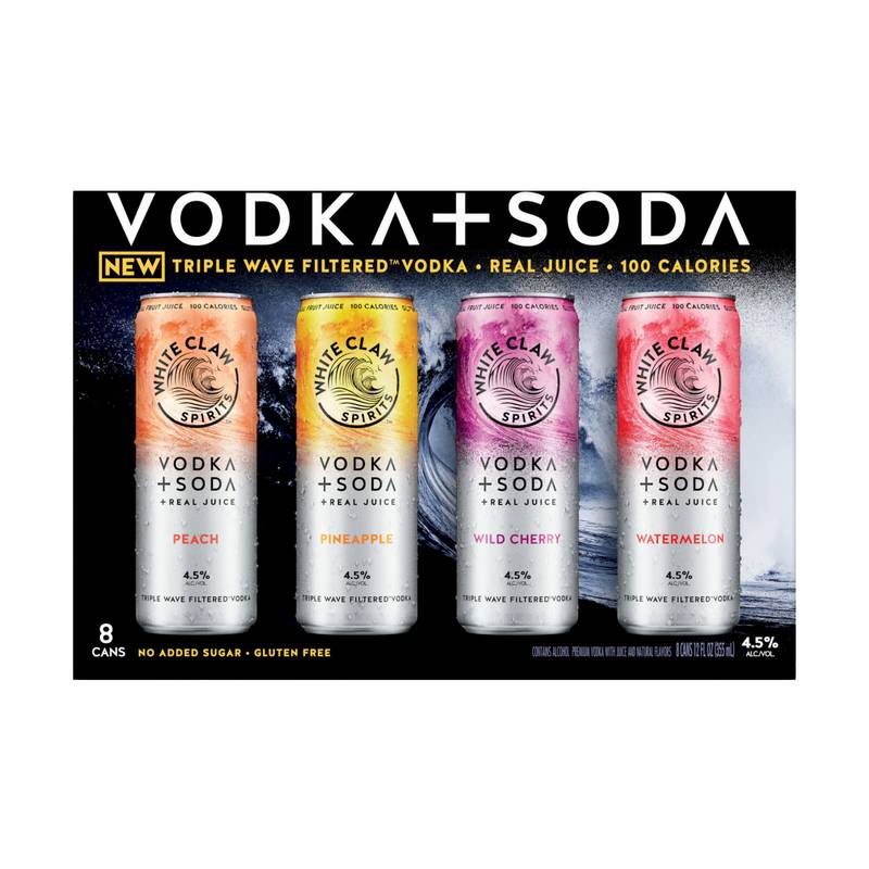 White Claw® Vodka + Soda Variety Pack. Born from the new wave of vodka. Made with the world’s first Triple Wave Filtered vodka, you choose which flavor to unleash – from tastes of dark ripe cherry, juicy peach, freshly cut pineapple and ripe watermelon. Each one delivers unrivalled taste refreshment with a smoother, superior finish.