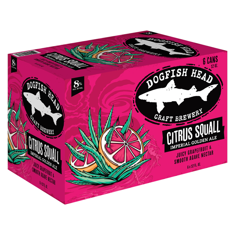 Dogfish Head Citrus Squall is a golden double ale brewed with blue agave, grapefruit puree, grapefruit and lime peels, pilsner malt and sea salt that drinks like the tequila-based cocktail that inspired it: The Paloma. 8% ABV.