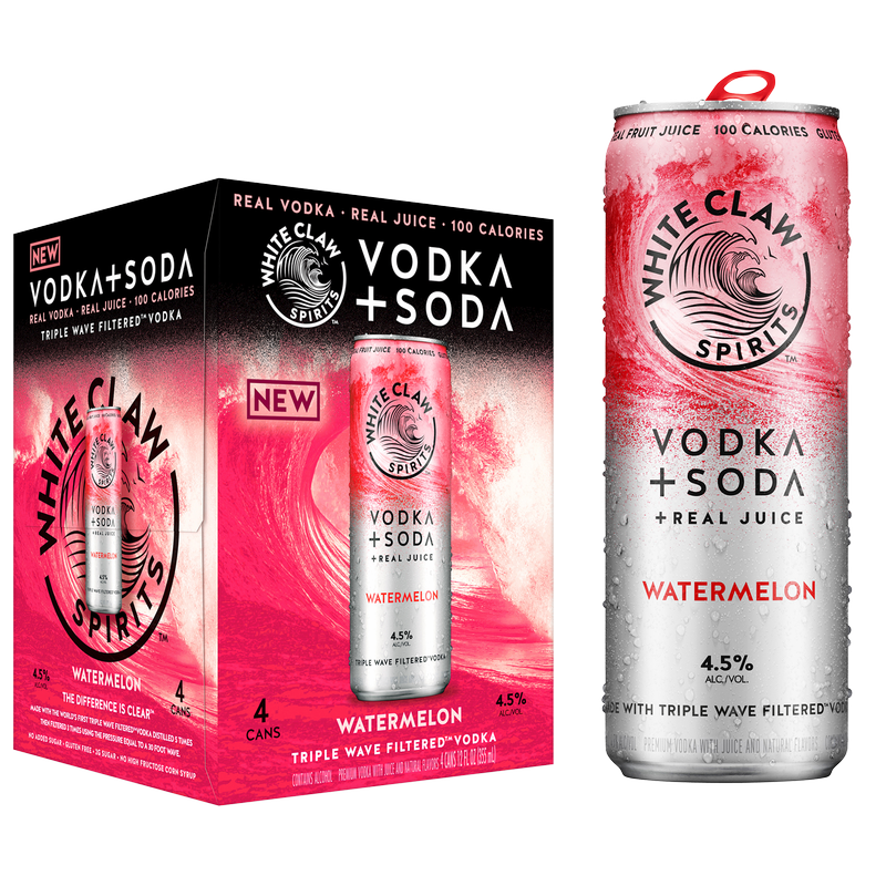 WHITE CLAW™ SPIRITS VODKA + SODA WATERMELON 12 FL OZ CAN White Claw® Watermelon Vodka + Soda. Born from the new wave of vodka. The world’s first Triple Wave Filtered vodka collides with the unmistakable taste of ripe watermelon flavor, crisp and juicy with a subtle bite of balancing rind. Together, delivering unrivalled taste refreshment with a smoother, superior finish.