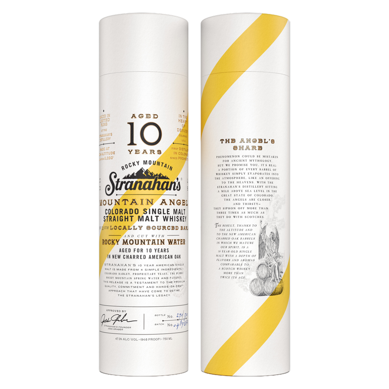 The first 10-Year-Old Straight American Single Malt Whiskey. Stranahan’s Mountain Angel is pushing the boundaries of American Single Malt Whiskey. This is an ultra-premium expression made with pristine Rocky Mountain ingredients. It is distilled, aged 10 years in new American oak barrels, and bottled over a mile high in the heart of the Rocky Mountains. (47.3% ABV - 94.5 proof)