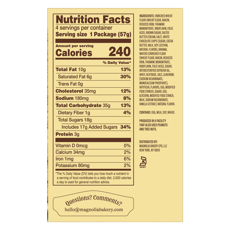 Magnolia Bakery’s world-famous Banana Pudding is now an indulgent cookie. A box of Classic Banana Pudding Cookies comes with four individually wrapped cookies, perfect for indulging on the go. Each soft-baked cookie is made with real butter, real bananas, real white chocolate chips and a scoop of vanilla wafers.