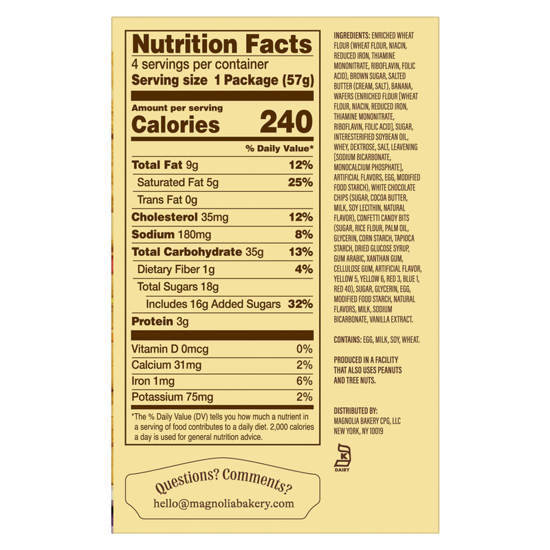 A perfect indulgence for any celebration, Magnolia Bakery's Confetti Banana Pudding Cookies pop with pastel confetti and a hint of birthday cake flavor. Celebrate premium ingredients with four individually wrapped cookies made with real white chocolate chips, real butter, and crunchy vanilla wafers.