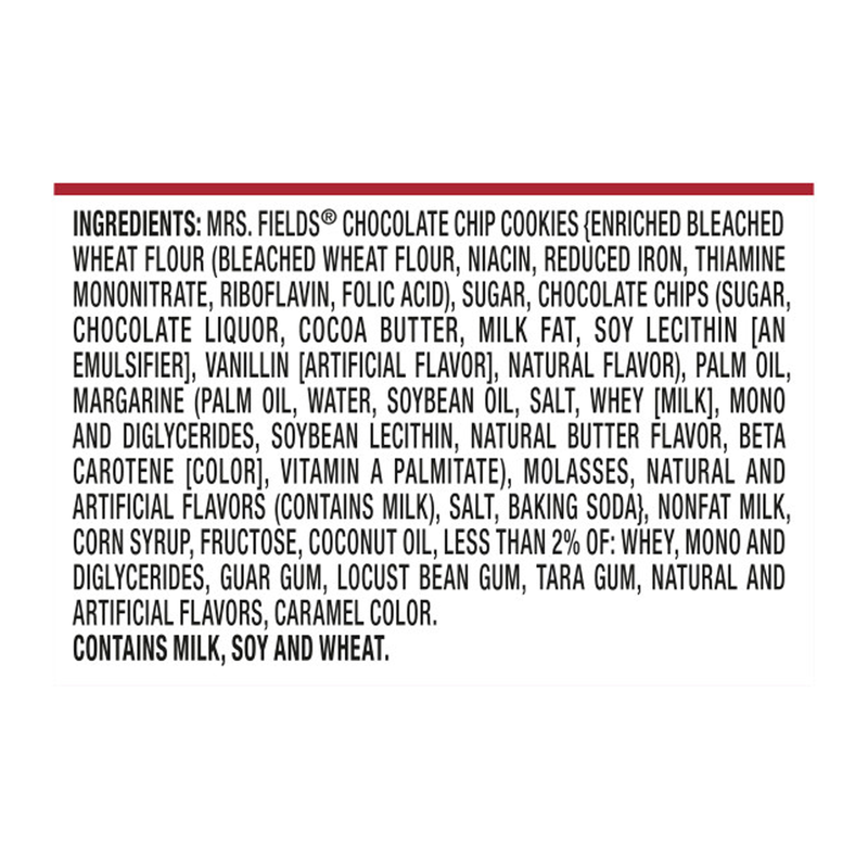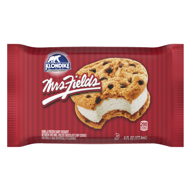 An American favorite cookie and simple dessert. Klondike Mrs. Fields frozen dessert cookie sandwiches has light vanilla between two deliciously chewy chocolate chip cookies. It's every cookie and ice cream lover's dream come true!
