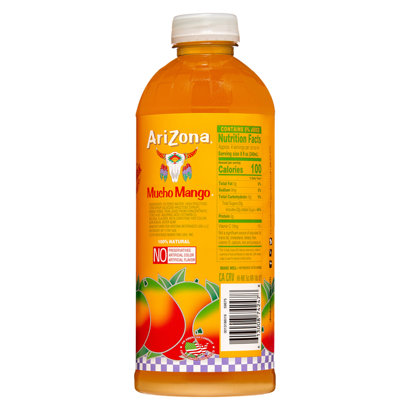 Savor a sip of sunshine with AriZona Mucho Mango Juice. Made with all-natural ingredients and foritfied with vitamin C, this fruity beverage is vacation in a can, quenching your thirst with a blast of exotic mango flavor.