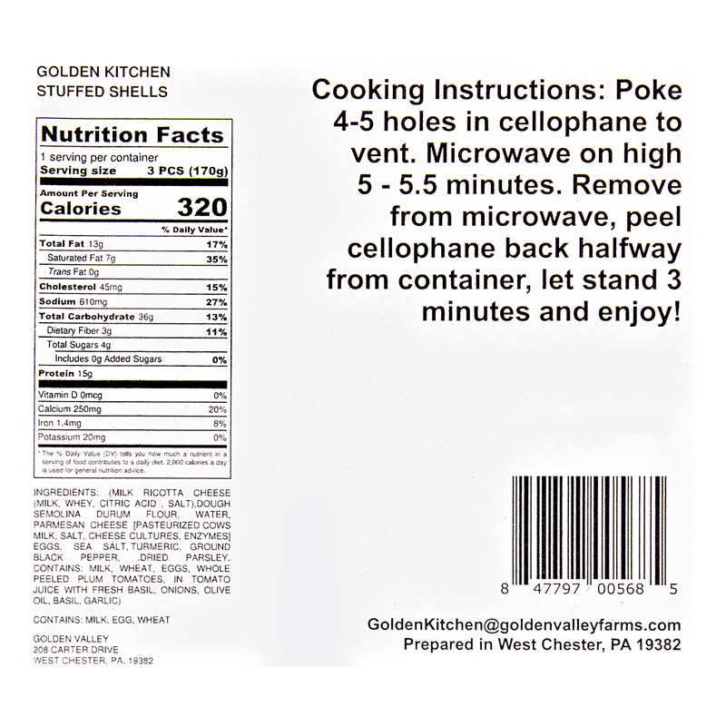 Freshly Preppared Stuffed Shells made with marinara sauce and ricotta! All natural ingredients. Preservative free!