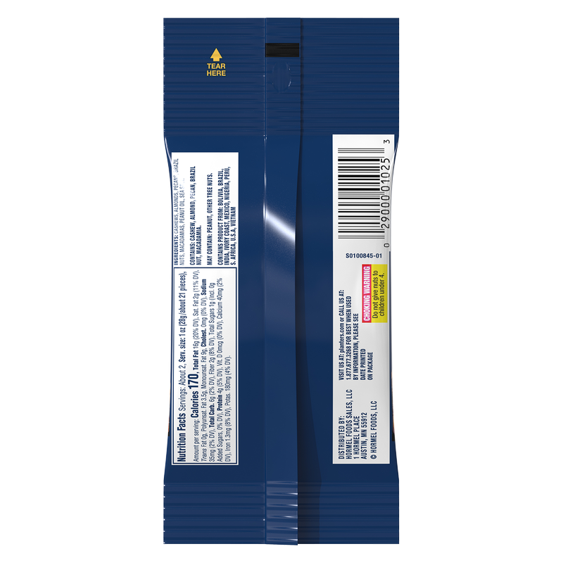 PLANTERS® Deluxe Mixed Nuts Bag With Macadamia Nuts are a tasty on-the-go snack with the crunchy texture you love. A blend of cashews, almonds, Brazil nuts, pecans and macadamias, these hearty mixed nuts with no peanuts wont let you down when you crave a rich nutty treat. This snack size bag of mixed nuts is a win-win because its easily portable and the roasted mixed nuts have delicious flavor