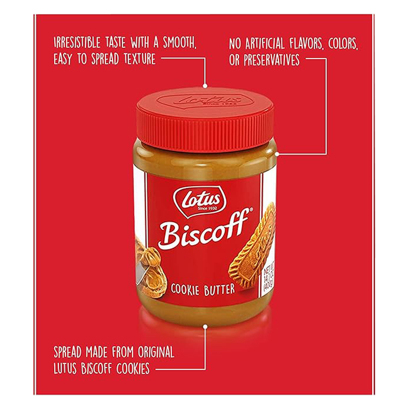 Lotus Biscoff Cookie Butter is a sweet spread made from original Lotus Biscoff Cookies. Irresistible taste with a smooth, easy to spread texture. Use as a delicious and unique alternative to nut butters (i.e. peanut butter, almond butter, etc) and chocolate spreads (i.e. hazelnut spread).