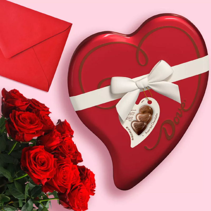 Featuring an assortment of DOVE Creamy Caramel Chocolate Candy, Milk Chocolate Heart Truffles and Dark Chocolate Heart Truffles, this heart-shaped tin is a delicious and thoughtful Valentine's Day gift.