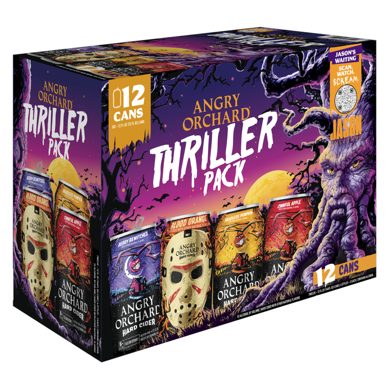 Trick or Treat just got a wicked upgrade. This Halloween, Angry Orchard teams up with Jason Universe to unleash the spookiest cider experience of the season. Inside this haunted variety 12-pack, you’ll find three frightfully delicious new flavors: Blood Orange, Berry Bewitched and Headless Pumpkin; plus fall favorite Cinnful Apple. Three cans of each. Pure scream-worthy refreshment in a limited edition glow in the dark package! Available through October. 5% ABV. Gluten free.