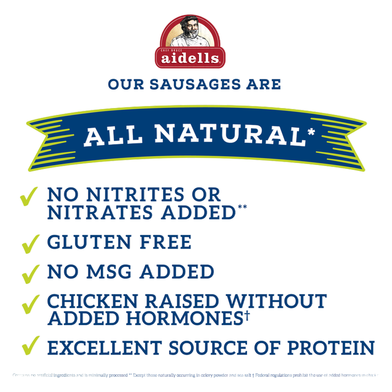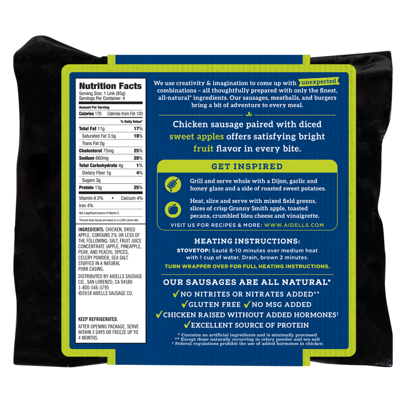 Get cooking with Aidells Smoked Chicken and Apple Sausage Links. Real chunks of apples paired with all natural smoked chicken for savory flavor and a hint of sweetness. Our precooked sausage is gluten free and has no added nitrites or nitrates, except for those naturally occurring in celery powder and sea salt. Our all natural sausages are hand stuffed in natural casings.