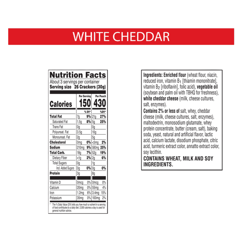Make snack time more fun with Cheez-It White Cheddar Baked Snack Crackers. Cheez-It Baked Snack Crackers are the real deal - made with 100% real cheese that's been carefully aged for an irresistible taste. Each perfect square is loaded with bold, cheesy flavor that hits your taste buds with every delicious mouthful. A baked snack, Cheez-It crackers are perfect for game time, party spreads, school lunches, BBQs, after-school snacks, snacks at the office, late-night snacking and more - the cheesy options are endless. Ideal for on the go too, Cheez-It crackers are great to bring along on field trips, camping, hiking, trips to the park, picnics, outdoor concerts, everyday errands, and more. The antidote to flavorless crackers, Cheez-It Original crackers are packed with irresistible cheesy flavor and are a great addition to homemade snack mixes and party mixes. You'll love the one-of-a-kind flavor of real cheese in every tasty handful of Cheez-It White Cheddar Baked Snack Crackers.