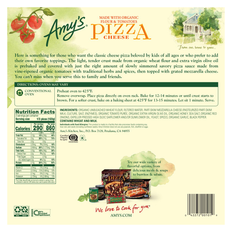 Savory, house-made pizza sauce made from organic tomatoes with grated part-skim mozzarella cheese sprinkled by hand, Light, tender, hand-stretched crust made from organic wheat flour and extra virgin olive oil. Great-tasting cheese pizza that's perfect any time.