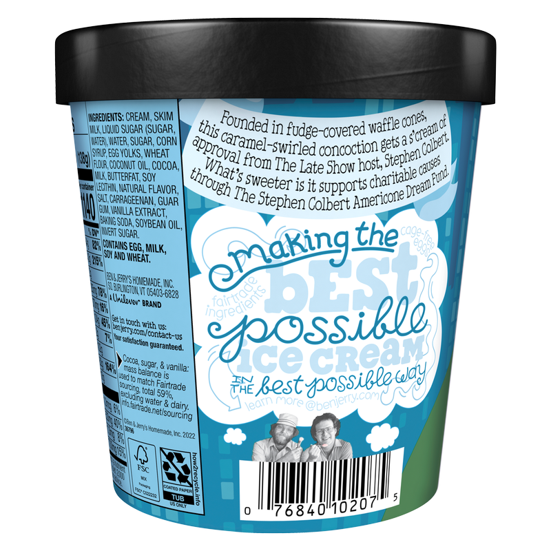 Ben & Jerry's AmeriCone Dream Ice Cream is made of sweet vanilla Ice Cream with fudge-covered waffle cone pieces and a caramel swirl. Ben & Jerry’s churned up this delectable creation in honor of The Late Show host, Stephen Colbert. The cherry on top is that this flavor supports charitable causes through The Stephen Colbert AmeriCone Dream Fund. Each pint of Ben & Jerry's is crafted with non-GMO sourced ingredients, cage-free eggs and cocoa, sugar and vanilla from Fair Trade Certified producers.