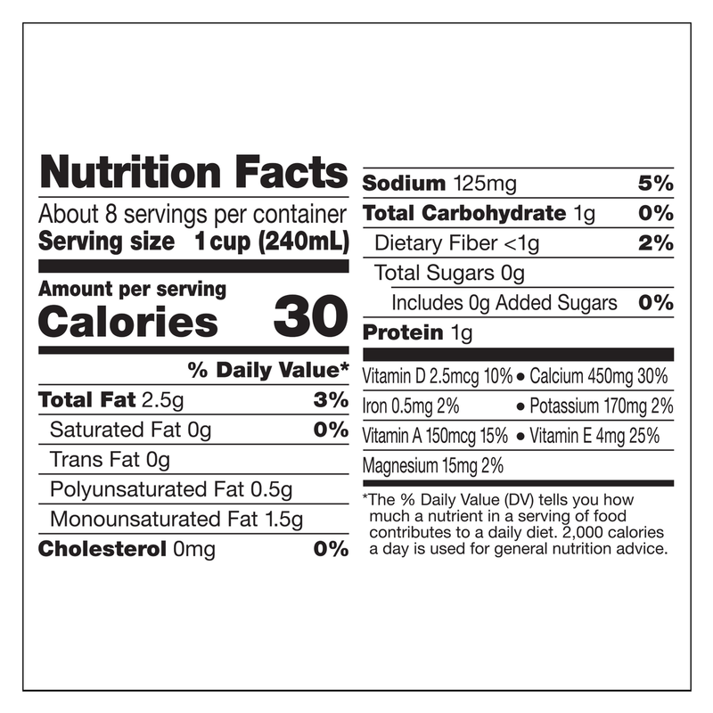 *See Nutrition Facts for sugar and calorie content. **Silk Unsweetened Almondmilk: 450mg of calcium per cup; reduced fat dairy milk: 293mg of calcium per cup. USDA National Nutrient Database for Standard Reference. Data consistent with typical reduced fat dairy milk.