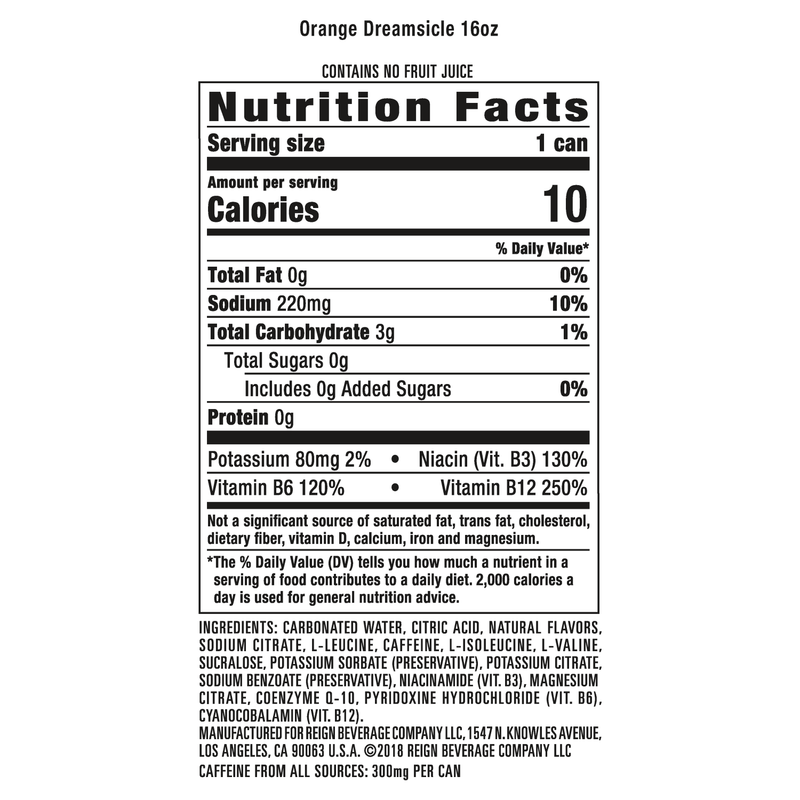 Blended with BCAAs, Natural Caffeine, CoQ10, and electrolytes, Reign Total Body Fuel is designed for your active lifestyle. Offering zero sugar, 10 calories, and zero artificial flavors & colors, Reign is the ultimate fitness-focused beverage to support your high-performance needs.