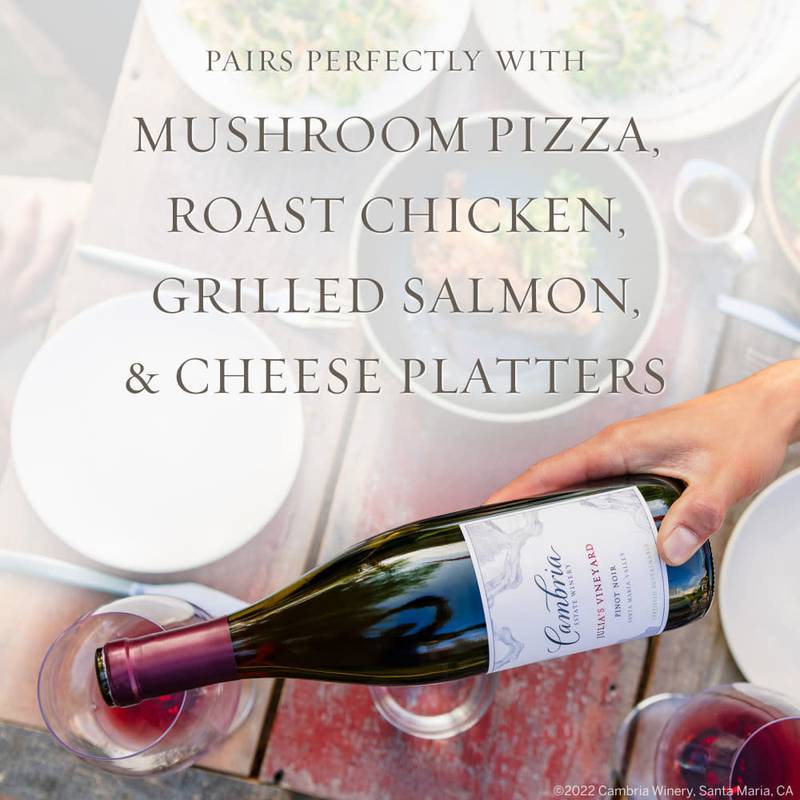 Cambria Julia’s Vineyard Pinot Noir Red Wine is sourced from Santa Barbara County and displays coastal, single vineyard elegance with an authentic sense of place. It is classic and refined, with a twist. This Cambria red wine Pinot Noir displays ripe blackberry and blueberry flavors for an elegant dry red wine. Additionally, this classic and refined California wine features notes of cranberry, cherry and pomegranate. With a balance of earth and baking spice, this red wine offers firm tannins and a long finish. The 2022 vintage of this Pinot Noir wine received 91 points from Vinous’ Antonio Galloni in August 2024. All of the estate vineyards are certified sustainable by the CCSW (Certified California Sustainable Winegrowing) and SIP (Sustainability in Practice) programs. Pair this dry wine with mushroom pizza, roast chicken, grilled salmon and a mild cheese platter. Cambria wines are family-owned, sustainably farmed and passionately tended by a team proud to be stewards of a remarkable property. Each wine bottle bearing the Cambria name is grown, produced and bottled on the estate. This bottled wine has a 14.2% ABV.