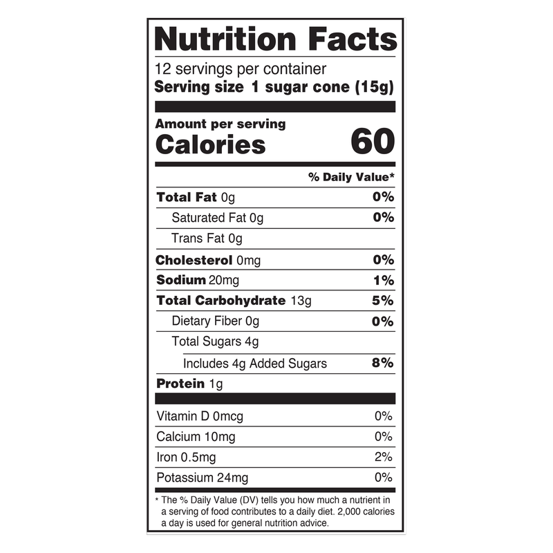 Traditionally made with brown sugar, making them taste a bit sweeter, sugar cones are conical with a pointy tip. The sugar cones are also thicker and sturdier than other types of cones and won’t get soggy as ice cream melts, which makes sugar cones ideal for slow eaters. Joy sugar cones are continually selected by independent consumer taste panels as the best-tasting sugar cones on the market. We think you’ll agree!
