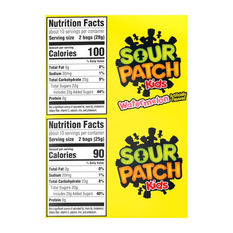 Make your house a trick-or-treating hot spot with this SOUR PATCH KIDS Original & SOUR PATCH KIDS Watermelon Halloween Candy Variety Pack. Each treat-sized bag of SOUR PATCH KIDS Original contains sour candies in signature assorted fruit flavors that create a SOUR THEN SWEET treat to satisfy your taste buds. Add a little fun to your Halloween treats with the unique kid shapes that give these candies their name. SOUR PATCH KIDS Watermelon candy packs intense watermelon flavor for a blast to your taste buds. Each piece is shaped like a watermelon slice to add excitement to snacking. As a fat free food, SOUR PATCH KIDS trick or treat candy bags make great Halloween treats to snack on during Halloween movies, or to give out at trunk or treat events. A perfect addition to your Halloween party supplies, these Halloween candies are great for arranging alongside your Halloween decor, or candy wreath, as grab-and-go treats. Each individual snack pack is the perfect size for Halloween candy bags, Halloween treat bags and Halloween party favors. Stay stocked with bulk Halloween candy so you're always ready for the next trick-or-treater at your door.
