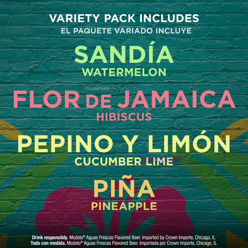 Modelo Spiked Aguas Frescas Variety Pack includes 12 slim cans of fruit-forward, flavored malt beverages, including Piña (Pineapple), Sandía (Watermelon), Pepino y Limón (Cucumber Lime), and Flor de Jamaica (Hibiscus) flavors. The lightly spiked, ready-to-drink beverages in this 12-pack are inspired by the traditional aguas frescas found in Mexico. With fewer than 200 calories* per can, a splash of real fruit juice**, and no artificial sweeteners or artificial flavors, they provide a lightly carbonated, full-flavored experience.