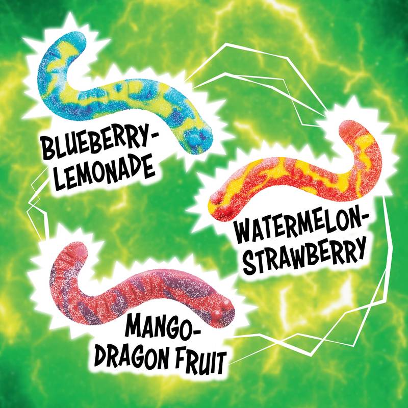 Are you ready to electrify your taste buds? Trolli Sour Electric Crawlers combines two sensationally sour flavors and vibrant colors in each soft and chewy gummy worm. Try the refreshing mix of Watermelon-Strawberry, the tangy sweet punch of Blueberry-Lemonade, or the bold and tropical twist of Mango-Dragon Fruit. Perfect for fans of sour gummies, these candies in bright neon colors are great for solo snacking or sharing the sour with friends and family.