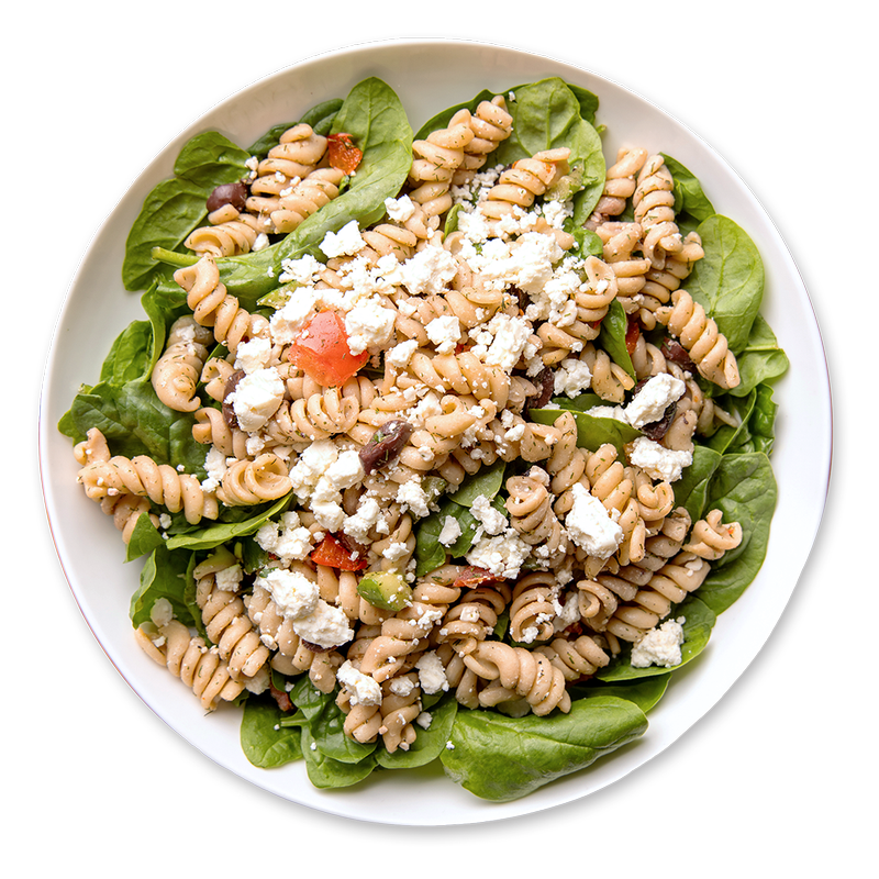 Greek Salad with feta cheese, rotini pasta, olives, and Greek vinaigrette