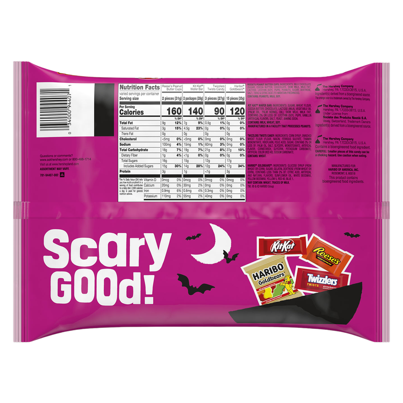 Enjoy a delicious chocolatey treat anywhere and anytime with Hershey assorted chocolate snack size candy. Offering four crowd-pleasing favorites, this candy assortment is perfect for sharing with family, friends, teammates or co-workers. Take this variety candy bag into the office break room, pour some individually wrapped candies into your jar at home or take a bag to your next sports game to celebrate the win. This assorted bag of chocolate candies contains HERSHEY'S milk chocolate bars, REESE'S milk chocolate peanut butter cups, KIT KAT milk chocolate wafer candy bars and ALMOND JOY coconut and almond chocolate candy bars.
