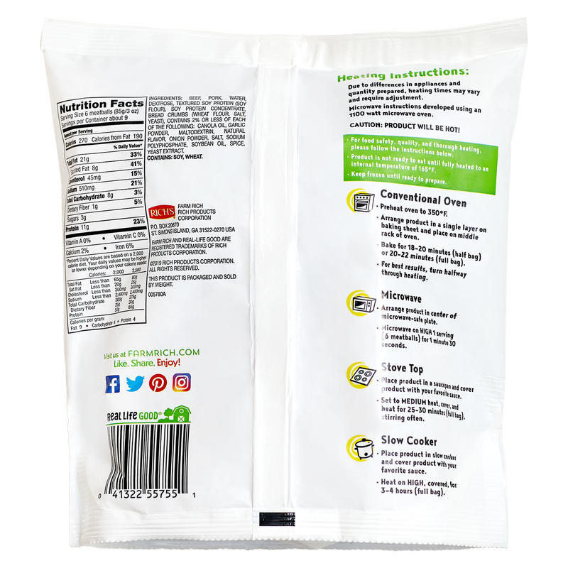 Farm Rich Homestyle Meatballs are seasoned with a custom blend of herbs and spices, including garlic and onion. These homestyle meatballs offer a mild and delicious flavor that pairs well with any recipe. They’re perfect for pizza or appetizers with your favorite dipping sauce.