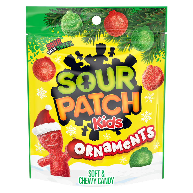 Spread a little mischievous holiday cheer with SOUR PATCH KIDS Ornaments Holiday Candy. A fun Christmas candy for those on your naughty and nice list, this sour candy comes in green lime and redberry flavors for a blast to your taste buds that's SOUR. SWEET. GONE. Add a little fun to your stocking stuffer candy with these festive ornament-shaped Christmas candies. This SOUR THEN SWEET candy is a great holiday candy for families, coworkers and friends. SOUR PATCH KIDS Christmas candy is a must-have item for your list of holiday party favors, holiday party supplies and stocking stuffer ideas. Enjoy these SOUR PATCH KIDS holiday treats while putting up holiday decor, wrapping Christmas gifts, or watching your favorite Christmas flick. These sour gummy snacks come in a sealed bag to maintain its signature softness and SOUR THEN SWEET flavor.
