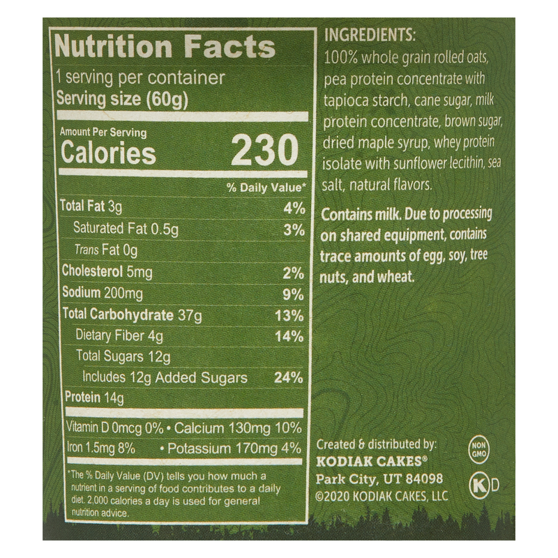 Like a cold glass of OJ on a sunny Sunday morning or maple syrup drizzled over a steaming stack of flapjacks, Kodiak Cakes Maple and Brown Sugar Oatmeal Unleashed is a breakfast classic - the only difference is you can enjoy this down-home staple on your way to work, after your morning workout, or at the office. Made with 14 grams of protein, 100% whole grain rolled oats, and non-GMO ingredients, Kodiak Cakes Oatmeal is a filling breakfast that’s ready to eat in less than a minute.