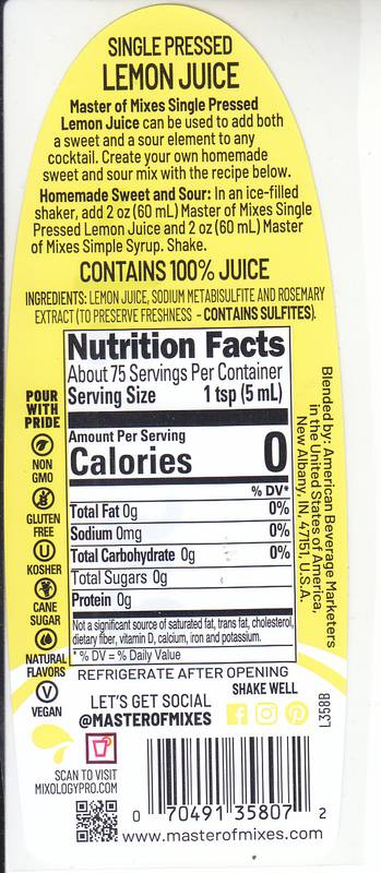 Master Of Mixes Single Pressed Lemon Juice 375mL Btl