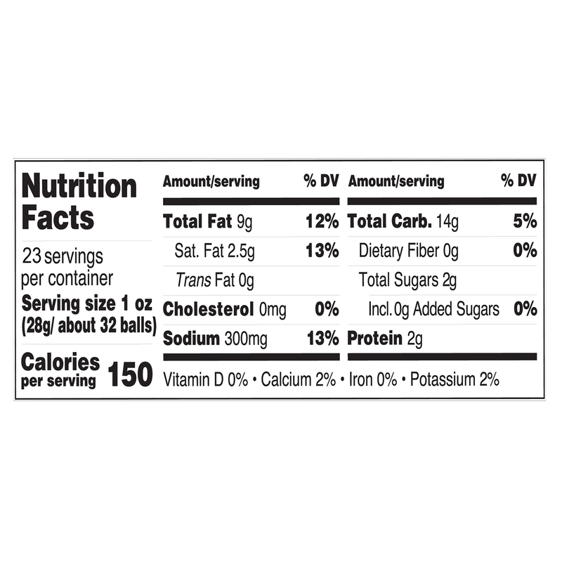 Cheeseballs made with real cheddar cheese. Delightfully poppable and finger-licking good. Party size barrel in resealable container to keep the fun going.