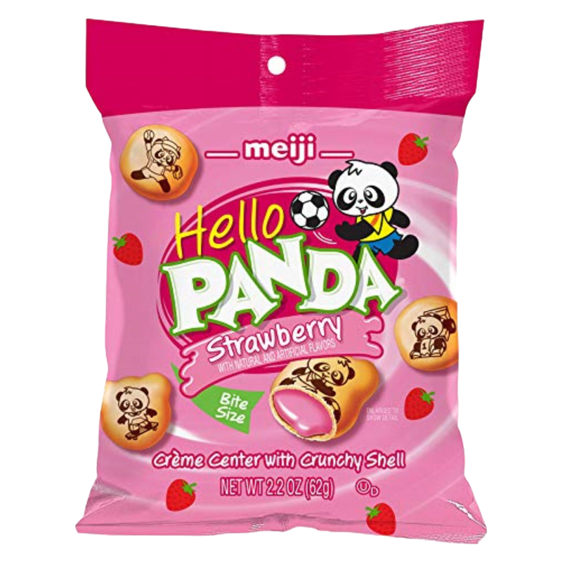 the meiji hello panda cookies feature a strawberry creme center & crunchy shell for the ultimate combo
