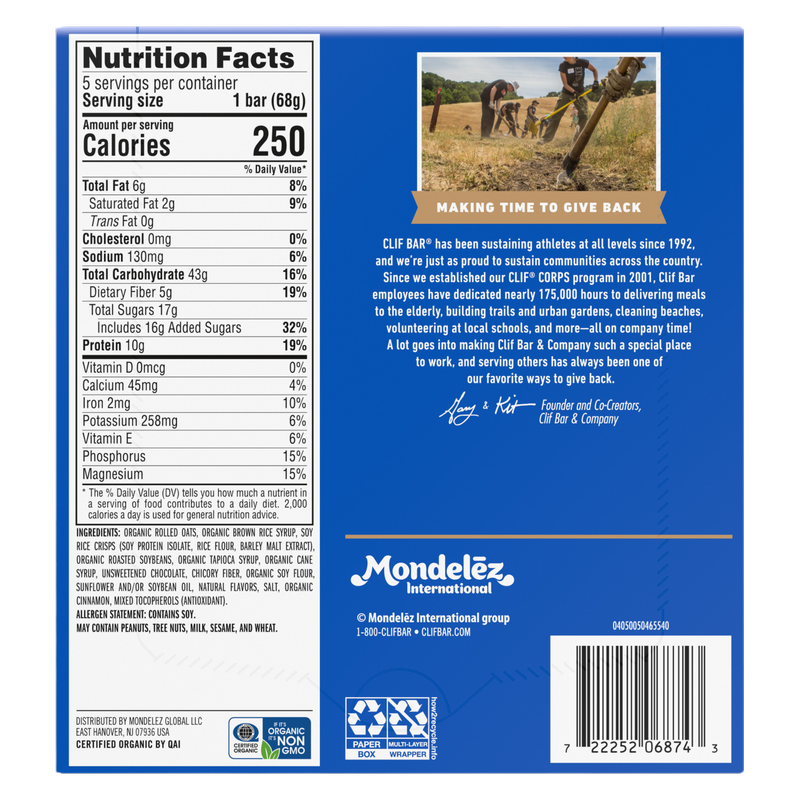 Born on a 175-mile bike ride and made with wholesome ingredients like organic rolled oats, CLIF BAR energy bars are crafted to help sustain active bodies before and during long-lasting activity. Today, CLIF BAR remains the Ultimate Energy Bar. As part of the CLIF brand mission to help support a more sustainable food system, our LEED certified bakeries and Emeryville, CA headquarters run with the help of on-site solar arrays and/or offset electricity through the purchase of renewable energy credits (RECs). Also, as part of the Mondelēz goal we are working towards net zero carbon emissions by 2050. CLIF BAR energy bars are non-GMO and plant-based with no high-fructose corn syrup or artificial flavors. *Including the purchase of RECs