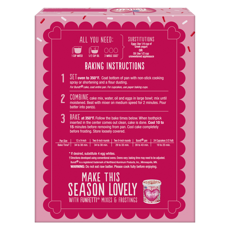 Easily prepare a delicious dessert with Pillsbury Funfetti Valentine's Cake Mix with Candy Bits. This Pillsbury cake mix delivers delicious cake with a moist texture, fun red candy bits and easy-to-follow instructions. The Funfetti cake mix contains all the dry ingredients you need to create tasty desserts at home in just three steps. Simply add water, vegetable oil and eggs to the dry baking mix, and stir to combine. After mixing the ingredients, bake your cake according to the time given on the box. This boxed cake mix makes enough batter for a 13 by 9 inch cake, two 8 inch round cakes or a standard Bundt cake. It can also be used as a cupcake mix to make up to 24 cupcakes. Decorate the cooled cake with Pillsbury Funfetti frosting or make your own cake creations like cake pops or a trifle for an extra special Valentine's Day treat. Pillsbury Funfetti Valentine's Cake Mix with Candy Bits is great for baking Valentine cupcakes, a cake or a holiday treat to give to those you love on Valentine's Day. The dessert mix comes in a 15.25 oz box that is easy to store in the pantry for a ready to prepare cake. From classic white to bright and bold, our cakes will take your next party or get-together to the next level. The Pillsbury Baking website has delicious and easy recipes, fun ideas and simple holiday baking tips to help you and your family create tasty memories together.