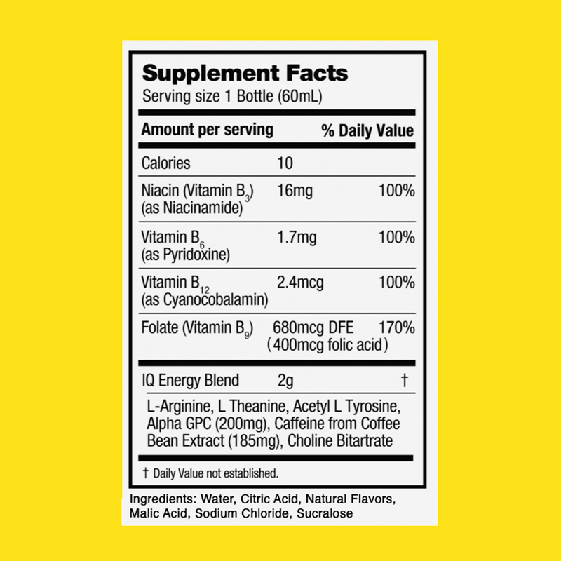 A Better For You Energy Shot with our IQ Blend for Energy, Focus & Mental Fortitude. L-Theanine & Alpha GPC for Increased Focus and Memory Function. No Preservatives, No Potassium Sorbate and No Sodium Benzoate.