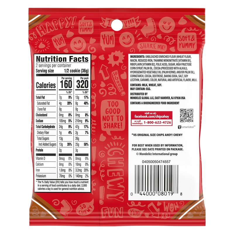 This. Is. Big. Snacking just got more exciting with delightfully decadent CHIPS AHOY! Chocolatey Brownie Big Chewy Chocolate Chip Cookies. Soft cookies baked to perfection for maximum chewy goodness, CHIPS AHOY! Big Chewy Cookies are more than three times larger than regular Chewy CHIPS AHOY! soft baked cookies for three times more yum! Sure to leave chocolate lovers satisfied and perfectly sized for sharing, these certified kosher snack cookies made with a special blend of cocoa and chocolatey chips for a brownie-inspired treat are convenient road trip snacks, school snacks, and office snacks, perfect for throwing in lunchboxes for special grab and go treats. These individually wrapped chewy cookies snack packs keep your CHIPS AHOY! cookie fresh and ready to grab for when you're on the go. The single-cookie packs also are ideal classroom party favors or office party snacks. Pair these big cookies with your favorite ice cream flavors, or – even better – use two cookies to make a customized Big Chewy cookie ice cream sandwich to share with friends. Each individually wrapped, single-cookie snack pack is ready to grab and go when you want to treat yourself or bring a little joy to any errand or occasion, anywhere!