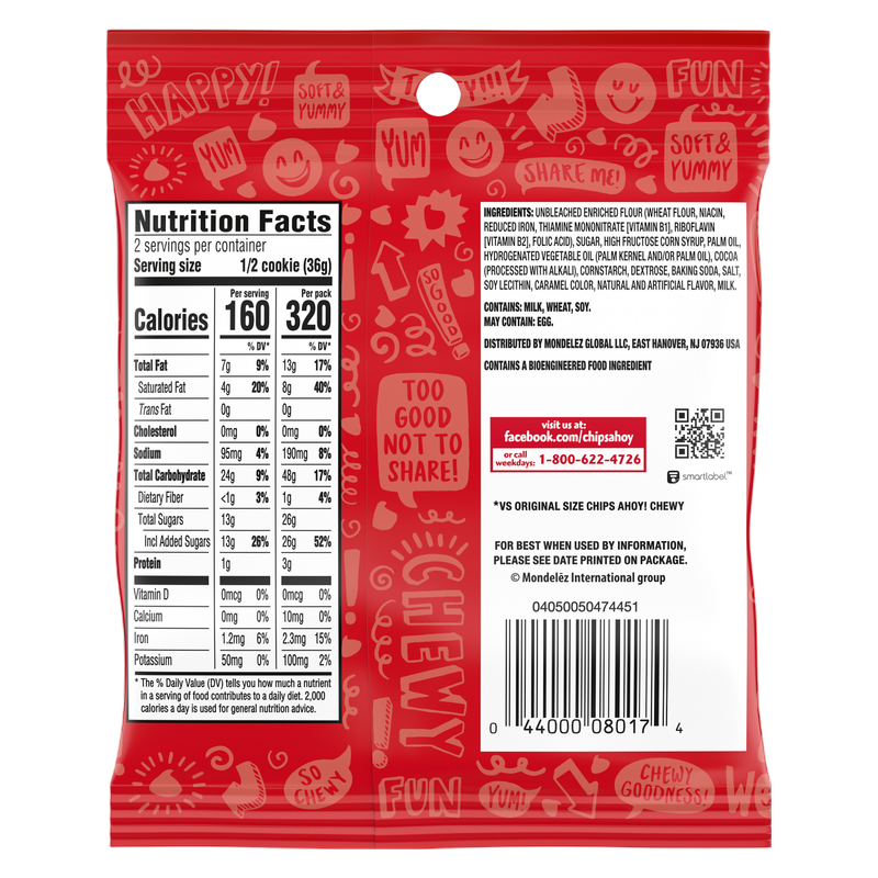 This. Is. Big. Snacking just got more exciting with delightfully decadent CHIPS AHOY! Big Chewy Chocolate Chip Cookies. Soft cookies baked to perfection for maximum chewy goodness, CHIPS AHOY! Big Chewy Cookies are more than three times larger than regular Chewy CHIPS AHOY! soft baked cookies for three times more yum! Sure to leave you satisfied and perfectly sized for sharing, these certified kosher snack cookies made with bigger chocolatey chips are convenient road trip snacks, school snacks, and office snacks, perfect for throwing in lunchboxes for special grab and go treats. These individually wrapped chewy cookies snack packs keep your CHIPS AHOY! cookie fresh and ready to grab for when you're on the go. The single-cookie packs also are ideal classroom party favors or office party snacks. Pair these big cookies with your favorite ice cream flavors, or – even better – use two cookies to make a customized Big Chewy cookie ice cream sandwich to share with friends. Each individually wrapped, single-cookie snack pack is ready to grab and go when you want to treat yourself or bring a little joy to any errand or occasion, anywhere!