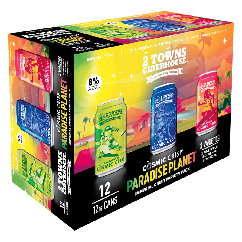 Cosmic Paradise Planet Variety 12pk: Variety Pack includes Original Cosmic Crisp, Tropical Cosmic Crisp and NEW: Pineapple Cosmic Crisp - only available in this format. 8% ABV. 2 Towns uses only real ingredients - NO concentrates and NO added sugar.