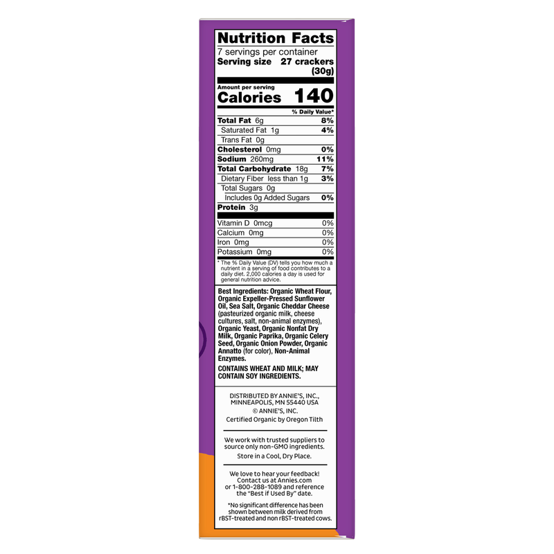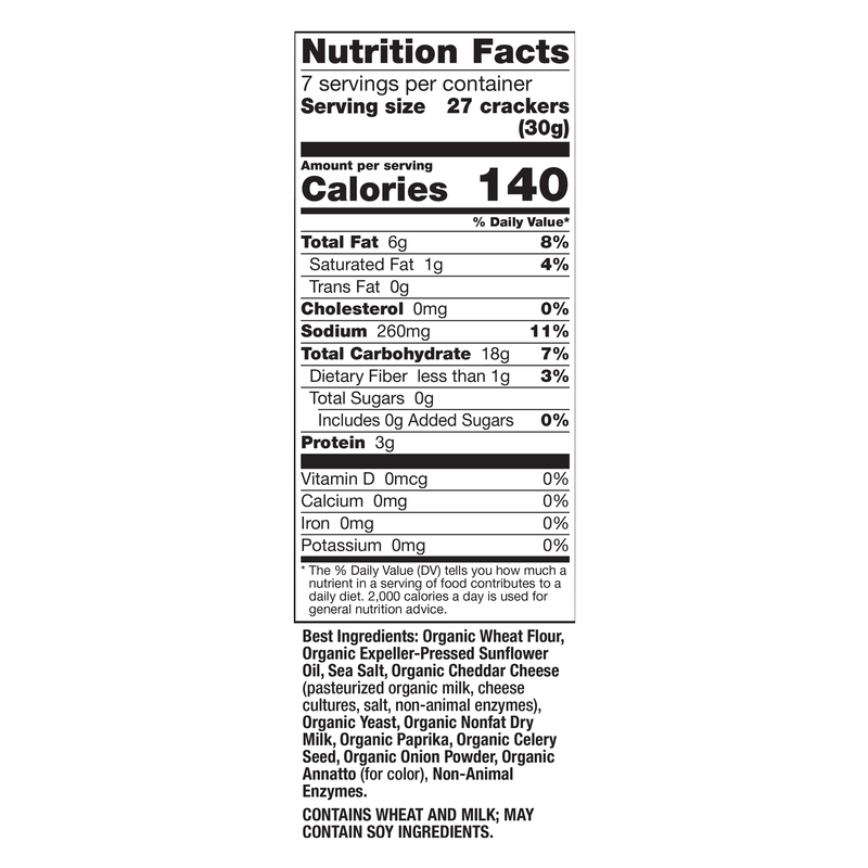 Whether it’s snack time or party time, these organic crackers are just the right thickness to pack the perfect crunch. Serve ‘em with your favorite spread or pack ‘em in a lunch box plain. Made without any of the artificial stuff, these organic, real cheese-baked bites are delicious any way you snack ‘em.