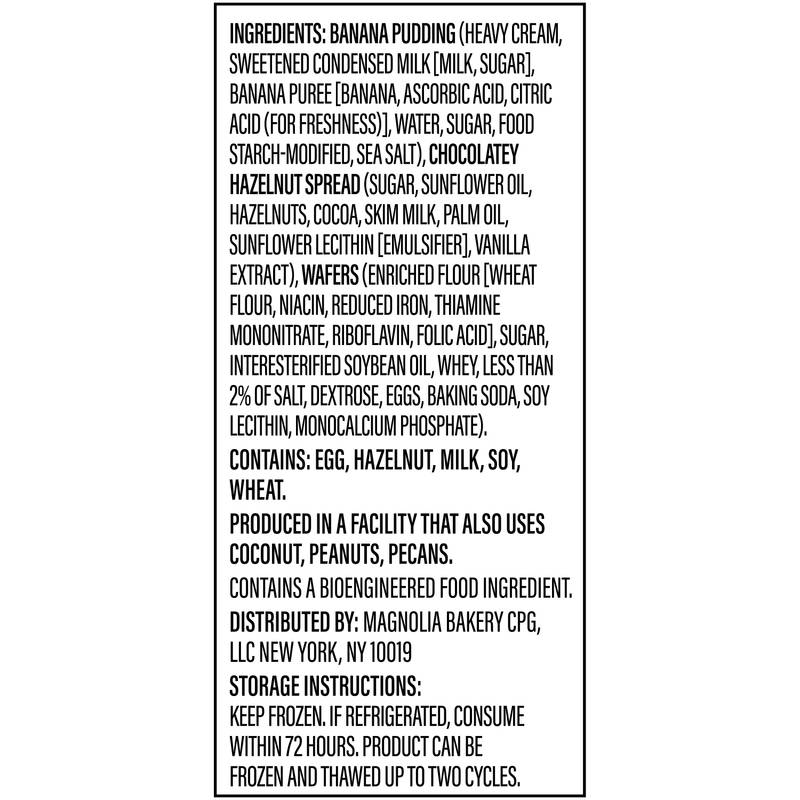 Indulge in Magnolia Bakery's new frozen-to-thaw Banana Pudding with Chocolatey Hazelnut Swirl, a delightful, naturally flavored treat whipped to perfection with rich chocolatey hazelnut swirls and wafer cookie bits. This creamy dessert captures the classic flavors of banana pudding and is made with real bananas. For best results, remove the container from the freezer and thaw it in the fridge for 2-3 hours before enjoying. Chocolate lovers, this is for you.