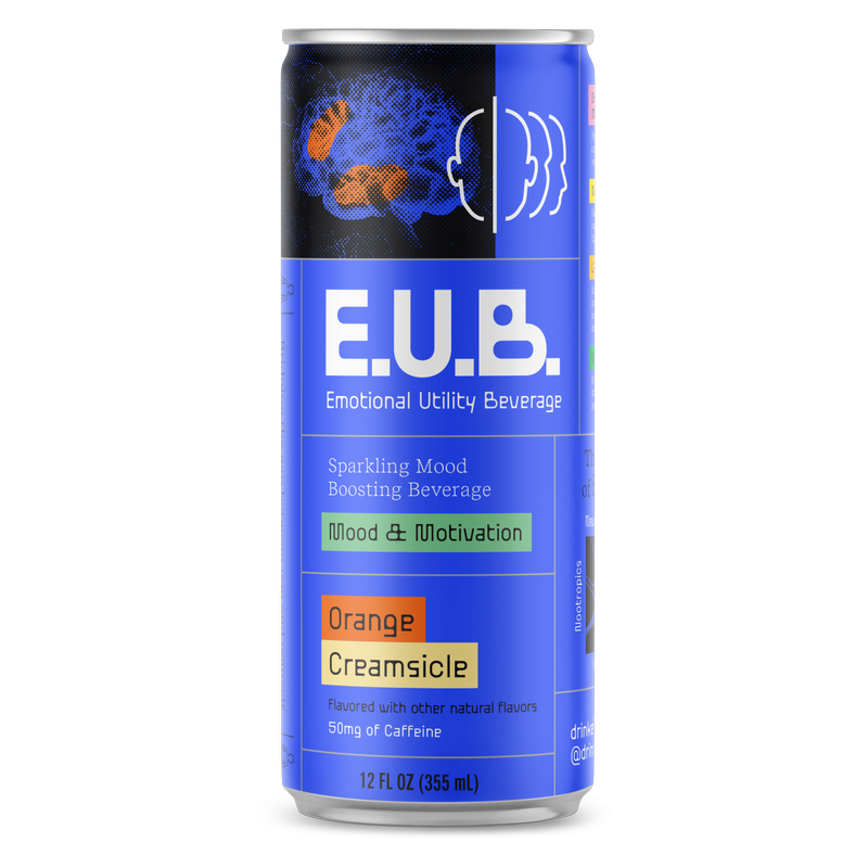 A flavor you’ll love at first sip. This upgrade from a childhood classic still has that unmistakable sweet orange and vanilla flavor, but this time… it’s good for you. With only 25 calories and 5g of sugar, E.U.B. Orange Creamsicle is a functional sparkling beverage that supports the body's chemical messengers ("neurotransmitters") to boost mood and motivation. Featuring Organic Lion's Mane Mushroom, L-Tyrosine, L-Theanine, 50mg Organic Green Tea Caffeine, Vitamin B5 & B6, and Magnesium. Featuring all natural flavors and no artificial sweeteners, E.U.B. Orange Creamsicle will have you thinking you’re a kid again, but this time you can have seconds.