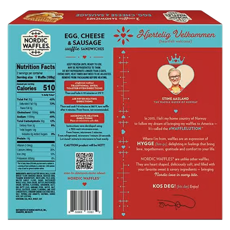 Revolutionize your morning routine with the Nordic Waffles Egg, Cheese, and Sausage Waffle Sandwich 2-Pack. It's the ultimate breakfast convenience for busy mornings, combining a soft, thin waffle with the deliciousness of egg, cheese, and savory sausage. Whether you're a gourmet breakfast enthusiast or just need a quick and satisfying meal on the go, this 2-pack of waffle sandwiches has you covered. Ready in minutes, Nordic Waffles are quick, easy, and on the go!