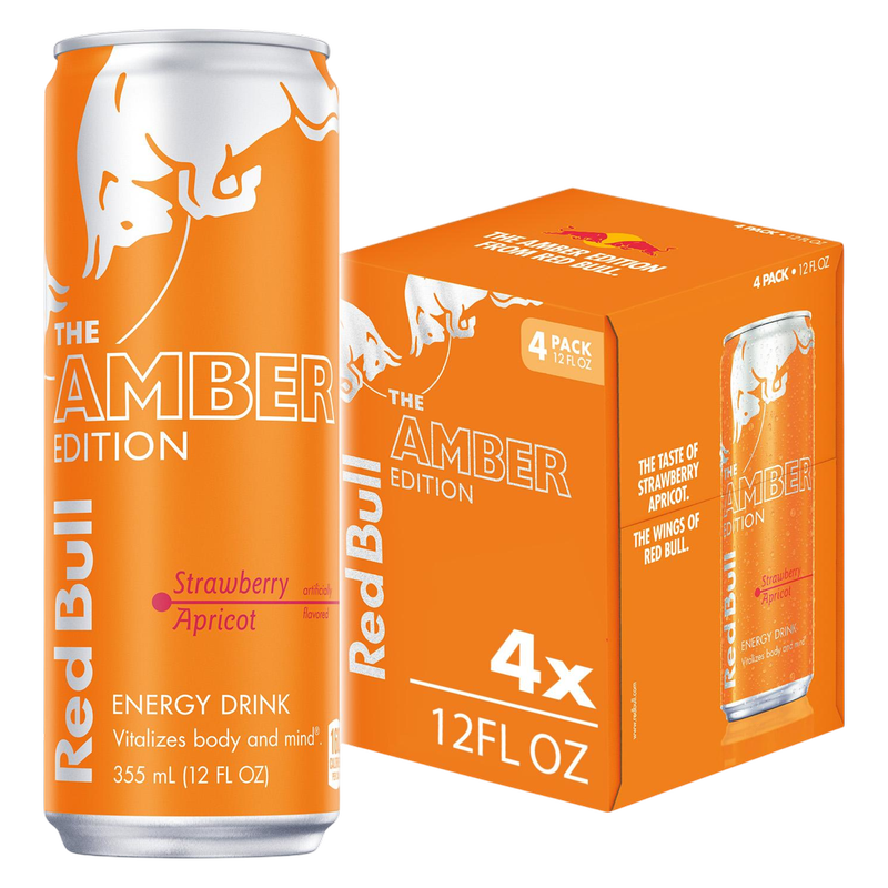 Red Bull Amber Edition Strawberry Apricot Energy Drink gives you Wiiings whenever you need them. Red Bull Amber Edition is a lightly carbonated energy drink with caffeine, taurine, B vitamins, real sugar and water, along with the perfect blend of strawberry and apricot flavors with a touch of peach taste.* With 110 calories per 8.4 fl oz can, Red Bull is great for any occasion. While aiming for great heights during your workday, in your workouts or when gaming, why not crack open a refreshing can of Red Bull? Drink Red Bull straight from the can or enjoy in a glass over ice. These 4-packs of Red Bull will keep you stocked for any occasion, whether it’s hanging with friends, watching the game or going on a road trip. Be ready for the big moments with a can of Red Bull. Store these cans of Red Bull at room temperature or toss them in the fridge. Red Bull gives you Wiiings.