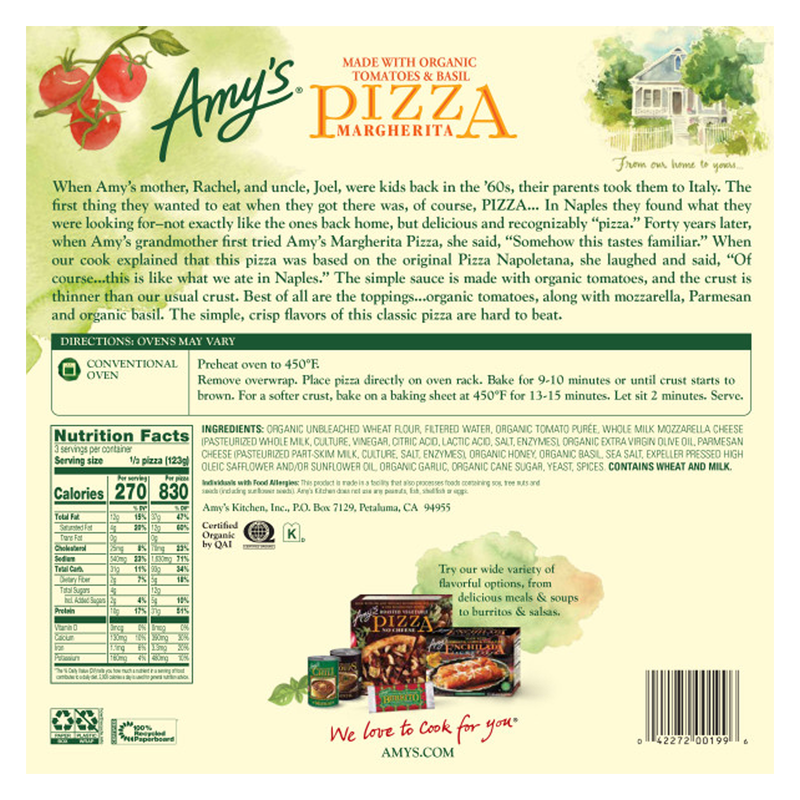 Simple and simply scrumptious. The Margherita has a thinner, hand-stretched crust, slowly simmered sauce made from organic tomatoes and seasonings, and is topped off with mozzarella cheese and a sprinkling of Parmesan and basil. Soy free/tree nut free/kosher