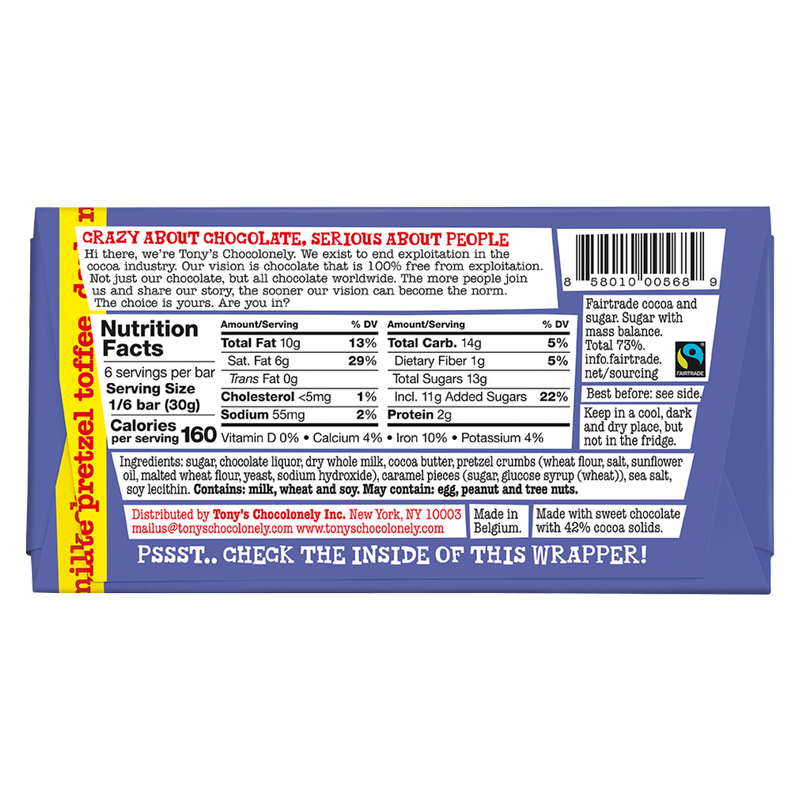Tony's Chocolonely 42% Dark Milk Chocolate with Pretzel and Toffee Bar 6.35oz