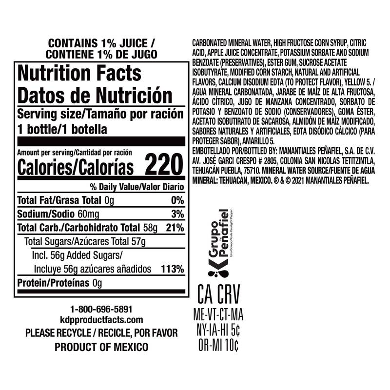 Peñafiel is the #1 mineral sparkling water brand in Mexico1, and it is proudly sourced from Tehuacán, Puebla, Mexico. It is an iconic brand that has been around for over 70 years. Peñafiel’s Sourced Mineral Water and Mineral Water with Juice offer variation in your beverages! Try all of the different varieties. Peñafiel Agua Mineral is an Unflavored Sparkling Mineral water. Peñafiel Agua Mineral mineral water is refreshing and bubbly; it is the ideal sparkling water to quench your thirst anytime, anywhere. Peñafiel also has Flavored Sparkling Mineral waters, which include Limonada and Naranjada. These Peñafiel “Ada’s” are the perfect match between sparkling mineral water and incomparable flavor. Try both the Limonada / Limeade flavor and the Naranjada / Orangeade flavor. Peñafiel Manzanita (Apple) delivers natural mineral spring water with refreshing bubbles and delicious apple flavor. All Peñafiel bottles are currently sold in Texas in single serve PET bottles size 600ml (20.3oz). All Peñafiel products sold in the US and Mexico are produced at the source, Tehuacán, Puebla, Mexico. Product sold in Texas also has the Hecho en Mexico claim on the bottle. (1Peñafiel is the share leader in the mineral sparkling water category in Mexico based on Nielsen data).