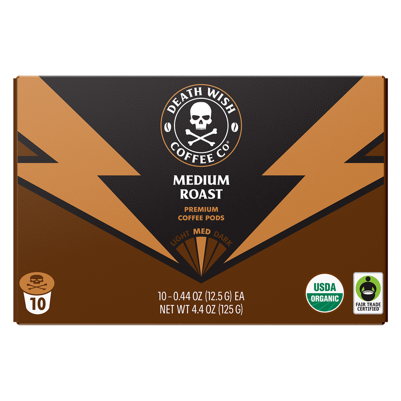 For a Morning Coffee Routine That's Lightning Quick. Death Wish Coffee Medium Roast Single-Serve Coffee Pods combine the bold taste of Death Wish Coffee with the convenience of single-serve coffee pods. Compatible with most K-Cup® coffee machines, each single-serve coffee pod contains our cult-classic levels of caffeine and complex flavor profile that's perfect for everyday, on-the-go coffee consumption. Our Medium Roast Coffee is sourced from the highest-quality, Fair Trade Certified, and USDA Certified Organic coffee beans in the world and roasted in the USA. Carefully grown at high altitudes with hints of caramel and roasted peanuts and notes of stone fruit and smooth milk chocolate, Death Wish Coffee Medium Roast Single-Serve, shelf-stable coffee pods help any coffee lover feel fueled and focused in a flash.*Death Wish Coffee has no affiliation with Keurig Green Mountain, Inc., and the statements herein have not been authorized by Keurig Green Mountain, Inc.