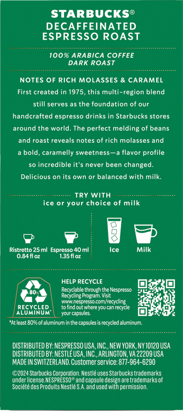 Enjoy the authentic café taste of Starbucks coffee at home like never before on Nespresso Original Machines. Made with the premium-quality Starbucks coffee that you know and love, Starbucks by Nespresso capsules are developed with Nespresso to work perfectly with Nespresso Original Machines and are fully recyclable through the Nespresso recycling program. Each cup of Starbucks Decaf Espresso Roast dark-roast decaffeinated espresso is rich with molasses and caramel notes and is perfect for making classic espresso drinks. Each precision-brewed Starbucks espresso is made with 100% arabica coffee beans. Authentically delicious perfection is just a cup away. Nestlé uses Starbucks trademarks under license. NESPRESSO is a registered trademark of Société des Produits Nestlé S.A., Vevey, Switzerland. NET WT 2.01 OZ (57 g)