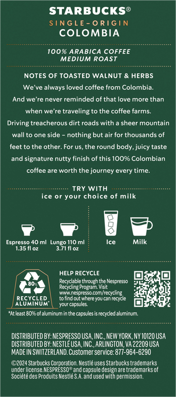 The same high-quality Starbucks coffee that you know and love is now made by Nespresso for you to enjoy at home. Plus, these capsules are made from aluminum for 100% recyclability and guaranteed coffee freshness. We’ve always loved coffee from Colombia. And we’re never reminded of that love more than when we are traveling to visit the coffee farms. For us, the round body, juicy taste and signature nutty finish are worth the journey every single time. Works with Nespresso Original Line machines, including: Essenza Mini, Pixie, CitiZ, Expert, Lattissima, KitchenAid, Creatista.