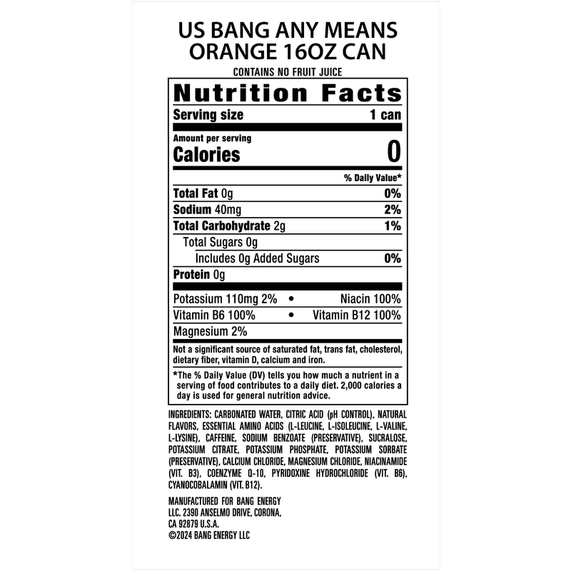 Bang Energy contains ZERO sugar, ZERO calories, CoQ10, Essential Amino Acids, and is loaded with vitamins B 3, 6, and 12! It is vegan, gluten-free, and contains NO artificial colors or BS.